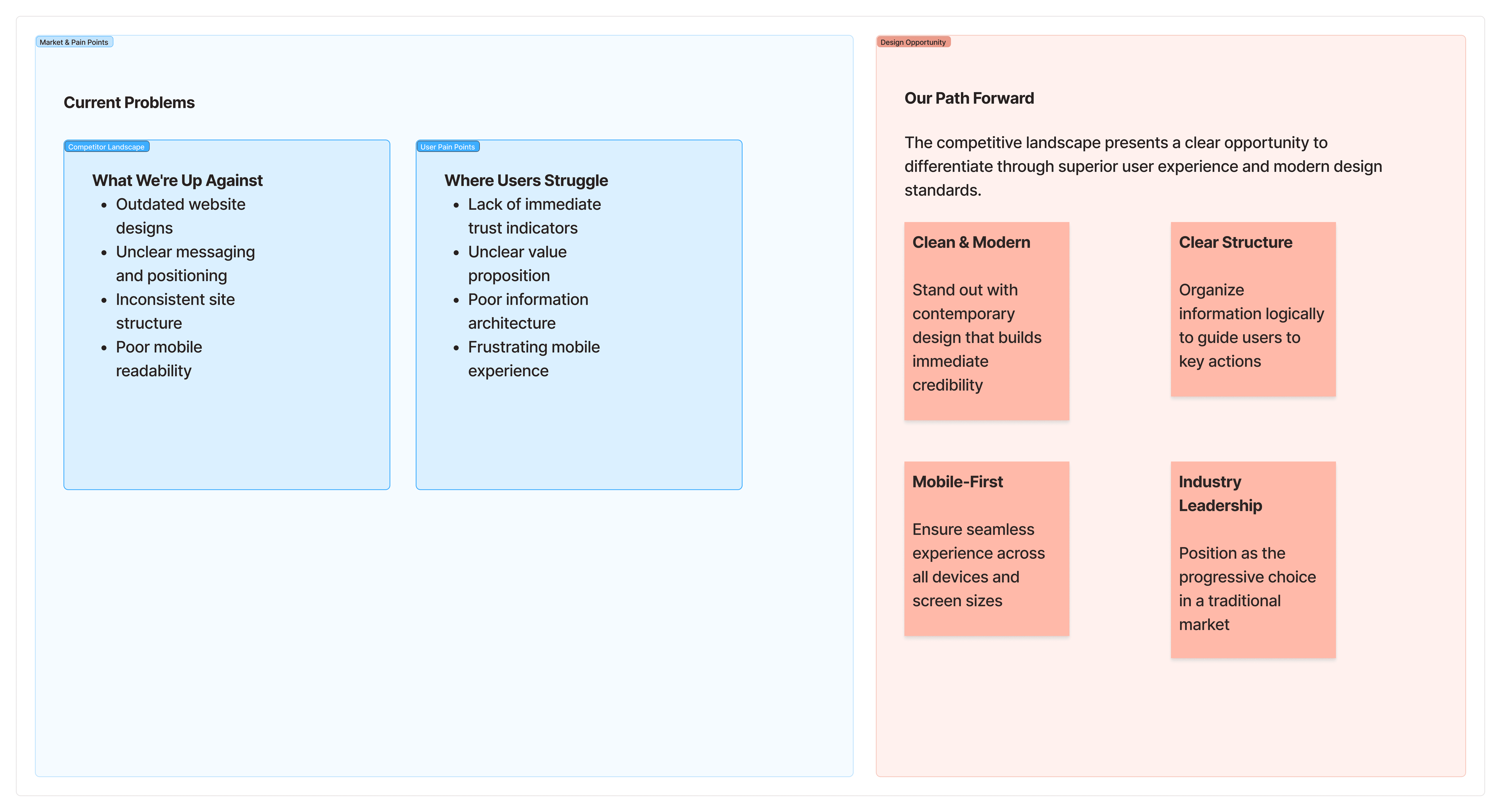A competitor review showed that most companies in this space had outdated websites, unclear messaging, and inconsistent structure. This revealed an opportunity: build a clean, modern site that immediately stands out with clarity and professionalism.