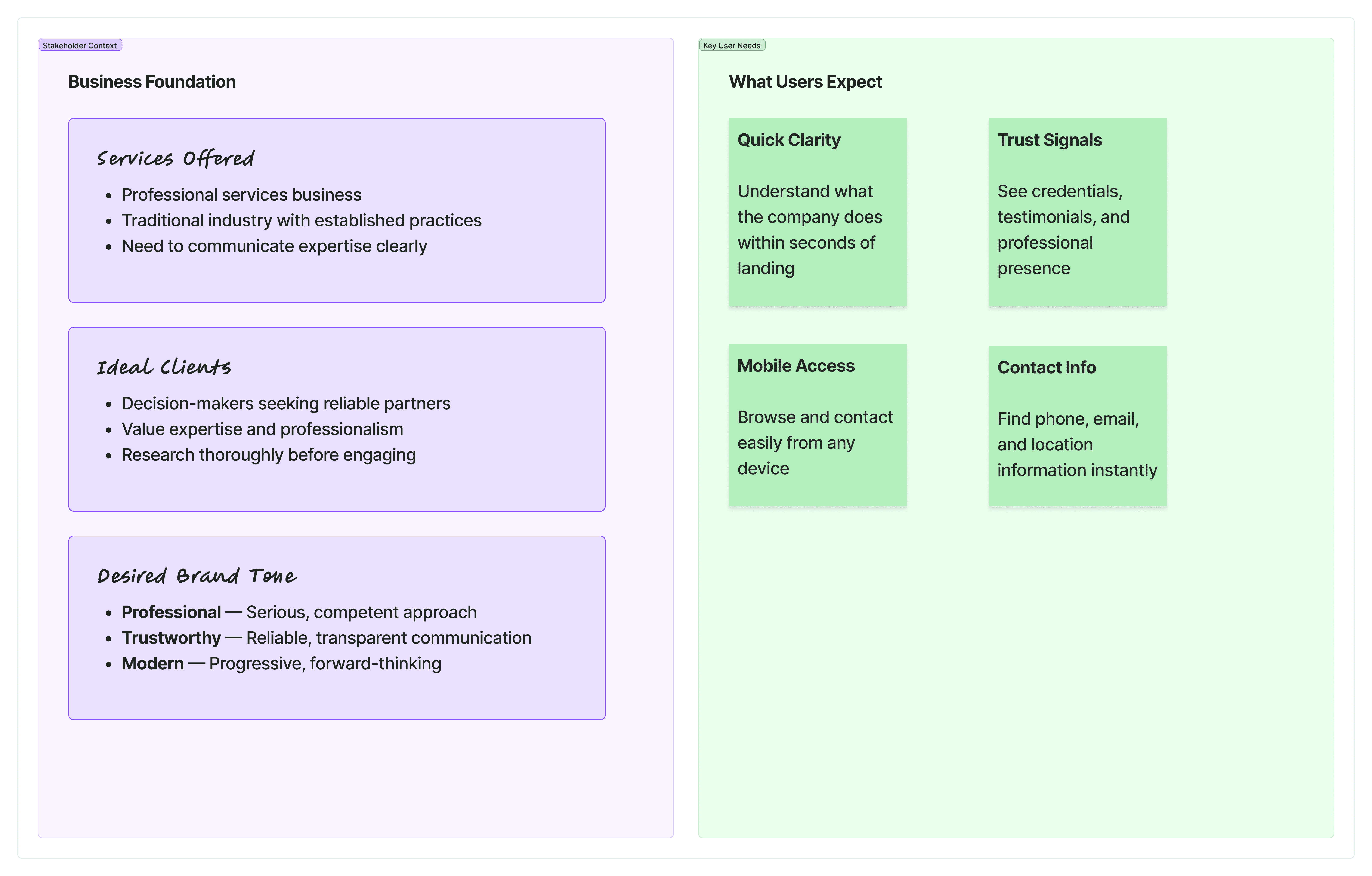 I began with a conversation with the owner to understand their services, ideal clients, and tone they wanted the brand to convey. Even without formal interviews, I could outline key user needs: